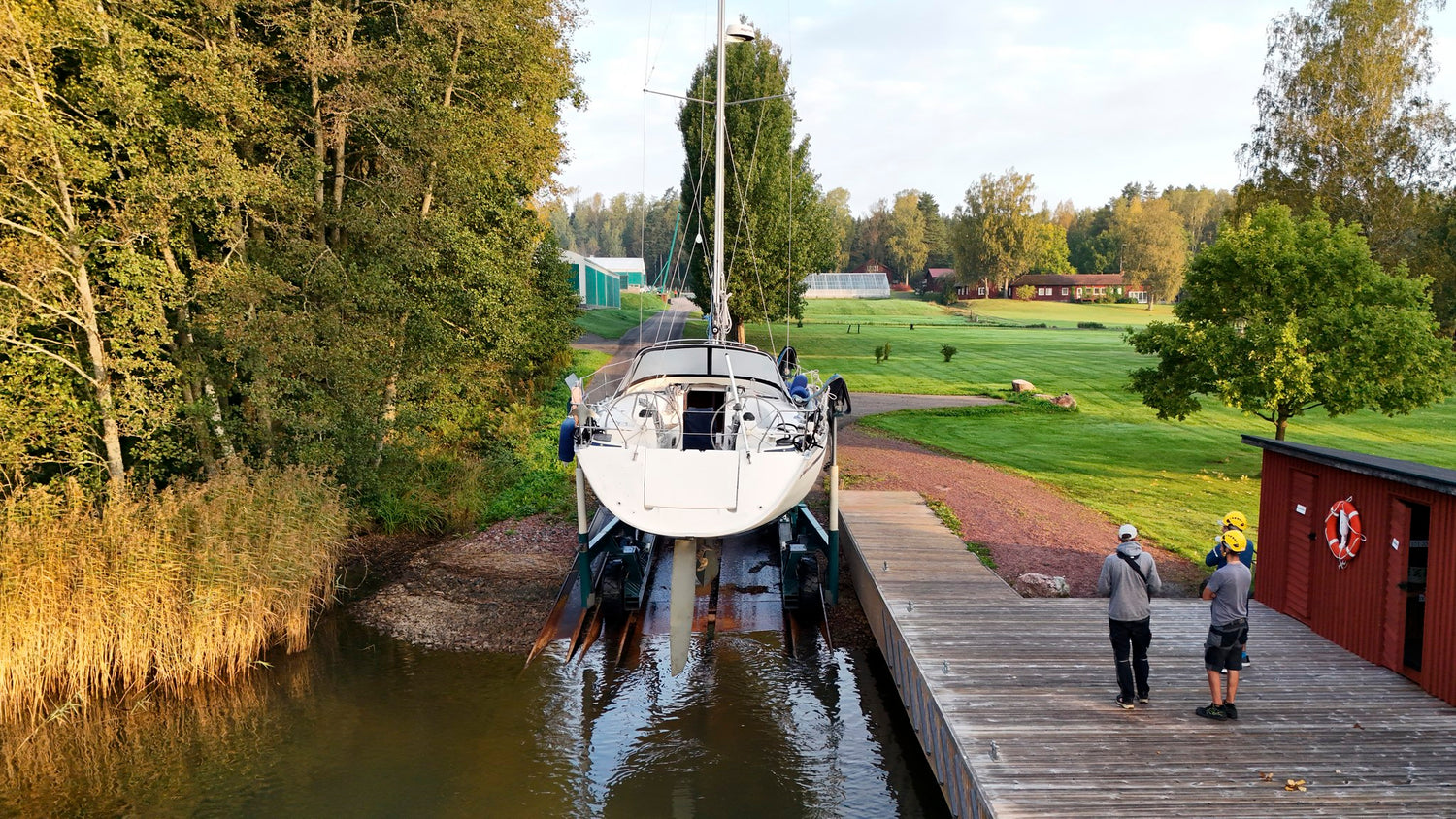Käytössämme on 2021 uusittu nostoramppi, joka on pidennetty ja syvennetty. Tukevaa nostoramppiamme käyttäen pystymme nostamaan purjeveneitä 3,5 metrin syväyksellä.
